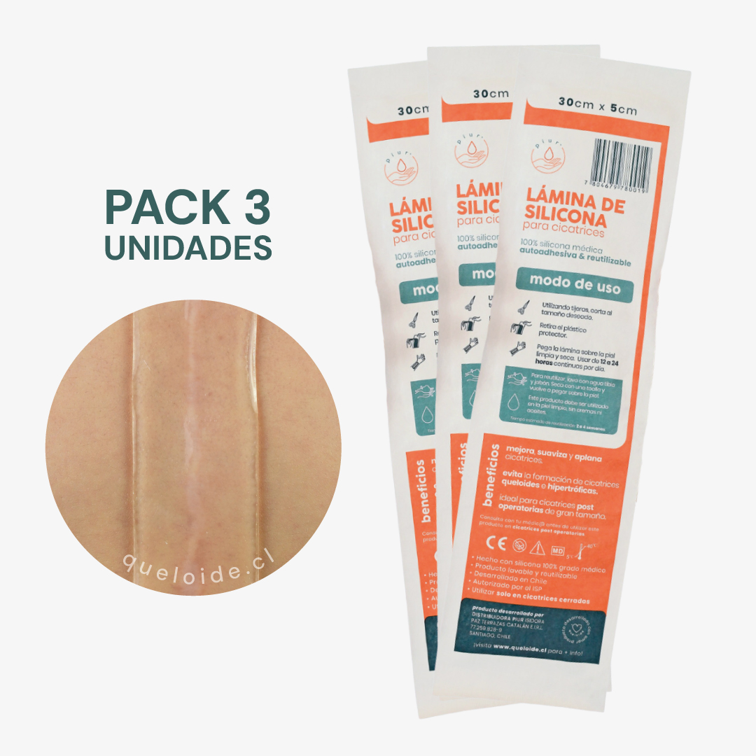 Las láminas de silicona transparente están hechas 100% con silicona médica y con 1,8mm de grosor, las láminas de silicona para cicatrices PIUR ® son suaves, cómodas, autoadhesivas y reutilizables. Aplanan, suavizan y desvanecen cicatrices normales, hipertróficas y queloides. Producto único en Chile.